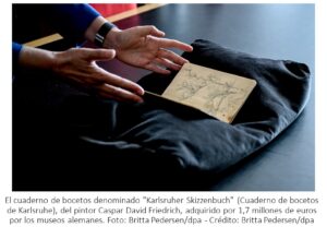 Compran cuaderno de bocetos de Caspar David Friedrich por 1,7 millones € Archivo - Archive Noticias - News Número 21 - Julio 2024 13 de julio de 2024 Berlín, 12 jul (dpa) – Un singular cuaderno de bocetos del pintor del romanticismo alemán Caspar David Friedrich (1774-1840) se suma a las colecciones públicas de museos de Berlín, Dresde y Weimar, según se anunció hoy. El cuaderno, denominado «Karlsruher Skizzenbuch» (Cuaderno de bocetos de Karlsruhe) fue adquirido por 1,7 millones de euros (1,85 millones de dólares). Está previsto que se presente de forma rotatoria en el Museo de Grabados y Dibujos de la Fundación del Patrimonio Cultural Prusiano de Berlín (SPK), las Colecciones Estatales de Arte de Dresde y la Klassik Stiftung Weimar (Fundación Clásica de Weimar). Las instituciones aportaron, según se informó, 200.000 euros cada una para adquirir la obra. Además, la Fundación Cultural de los estados federados y la fundación de arte Ernst von Siemens brindaron otros 550.000 euros cada una. El cuaderno de bocetos de Friedrich fue rematado el año pasado por la casa de subastas Grisebach por un total de cerca de 1,8 millones de euros. El valor del «Karlsruher Skizzenbuch» fue cotizado en hasta 1,5 millones de euros. El precio de subasta se fijó en 1,45 millones de euros, mientras que el precio bruto con la prima del comprador para la casa de subastas ascendió entonces a 1,819 millones de euros. Poco antes de la subasta se dio a conocer que el cuadernillo de 33 páginas con dibujos debía ser protegido como bien cultural. La administración cultural berlinesa inscribió el cuaderno en el registro de bienes culturales de valor nacional. Como consecuencia, se prohibió su exportación. Las colecciones que ya habían pujado en la subasta pudieron renegociar con éxito. El cuaderno de bocetos será exhibido primero en el Museo de Grabados y Dibujos de Berlín. En agosto, la pieza será presentada en Dresde y a partir de noviembre se expondrá en Weimar, donde el cuaderno permanecerá durante los cinco primeros años del periodo de intercambio acordado. Allí también será sometido a estudio. El cuaderno estuvo durante más de 200 años en poder de una familia en Karlsruhe. Según se informó, se trata del último ejemplar encuadernado conocido de uno de los cuadernos de bocetos del artista que estaba en manos privadas. Solo se conservaron seis de un total probable de 20 de estos pequeños libros. Cuatro de ellos, algunos encuadernados de forma incompleta, se conservan en el Museo Nacional de Oslo, otro en el Museo de Dibujos y Grabados de Dresde. Friedrich, nacido en Greifswald, en el extremo noreste de Alemania, supo guardar entre mediados de abril y principios de junio de 1804 este cuaderno de bocetos en el bolsillo de su abrigo de viaje. Los dibujos fueron creados en Dresde. Son finos dibujos en lápiz de árboles, ramas y troncos o diversos estudios de pájaros en vuelo. Varios de estos motivos fueron utilizados luego por el artista en sus obras principales, como por ejemplo el boceto de un roble en su obra temprana «Hünengrab im Schnee». Según el presidente del SPK, Hermann Parzinger, las grandes obras de Friedrich no existirían sin este cuaderno de bocetos.