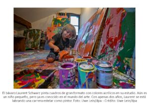 Laurent Schwarz: un artista alemán de apenas dos años que cautiva al mundo Archivo - Archive Noticias - News Setiembre 2024 1 de septiembre de 2024 Por Sabine Dobel (dpa) Neubeuern (Alemania), 27 ago (dpa) – Laurent Schwarz, un artista alemán de tan solo dos años, que aún usa pañales y chupete, está sorprendiendo al mundo del arte con sus pinturas, que ya alcanzan precios de hasta cinco cifras. Su primera exposición se llevará a cabo el 19 de septiembre en su ciudad natal, Neubeuern, en el sur de Alemania, justo dos semanas después de cumplir los tres años. El pequeño, cuya altura no supera algunos de los lienzos sobre los que pinta, empezó su «carrera» hace nueve meses, durante unas vacaciones familiares en la sala infantil de un hotel en Italia. Desde entonces, ha estado inmerso en la pintura, trabajando en un taller que sus padres, Lisa y Philipp Schwarz, han habilitado en su casa de 500 años de antigüedad. El lienzo y las pinturas acrílicas también estuvieron presentes en las últimas vacaciones. «Si no, no se hubiese subido al coche», comenta el padre. Laurent pintó en un parque. La jornada empieza a las 6:00 de la mañana con las palabras: «mamá, pintar, pintar». Entonces, Laurent toma todo lo que encuentra, pinceles, rodillos, espátulas, rejillas para pintura, trozos de madera, pero sobre todo mucha pintura. Echa chorros de color sobre el lienzo desde tubos llenos, divirtiéndose claramente, según muestra un vídeo en Instagram. Su obra favorita es una pintura de un elefante azul y a veces incorpora elementos como camellos, dinosaurios y figuras humanas. Su madre cuenta que pinta de forma abstracta y figurativa, y eso es lo que lo hace especial. A veces termina un cuadro en unos minutos, a veces al cabo de una semana. Produce varias pinturas simultáneamente y las completa con la palabra «¡listo!» antes de dirigirse a la bañera para limpiarse. Según revelan los padres, el inicio del fenómeno en torno a Laurent fue una casualidad. La madre subió la primera pintura de su hijo, «The Fingers», a Instagram para que los familiares en Suiza y la abuela pudieran verlo. Luego vinieron más imágenes. «Entonces, nos contactó una galería. Poco después, se vendieron las primeras pinturas», señala. Hoy en día, Laurent cuenta con más de 60.000 seguidores en Instagram. Ya se han vendido 25 de sus más de 35 cuadros, entre otros, a Estados Unidos, París, Londres, y algunos también a las Bahamas, Japón, Singapur. Lisa Schwarz comenta que hay unos 20.000 interesados en adquirir las pinturas de su hijo. El pequeño fenómeno alemán ha suscitado comparaciones con artistas consagrados como Gerhard Richter y Jean-Michel Basquiat, mientras que otros dicen que su estilo es similar al del artista estadounidense Jackson Pollock, que hizo famoso el llamado «action painting». Algunos historiadores del arte, sin embargo, cuestionan si el trabajo de los niños puede considerarse arte en el sentido estricto, debido a la falta de capacidad reflexiva en la infancia. A pesar de las críticas, la popularidad de Laurent sigue creciendo, y pronto lanzará su propia línea de colores y papeles pintados basados en sus obras.