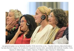 Mujeres de México, Chile y Macedonia del Norte reciben Medalla Goethe Archivo - Archive Noticias - News Setiembre 2024 1 de septiembre de 2024 Weimar (Alemania), 28 ago (dpa) – Tres mujeres procedentes de Chile, México y Macedonia del Norte fueron distinguidas hoy por el Goethe-Institut con la Medalla Goethe, el galardón más importante de la política cultural exterior de la República Federal de Alemania. Las medallas se entregan tradicionalmente el 28 de agosto, día del nacimiento del gran literato alemán Johann Wolfgang von Goethe (1749-1832). Las premiadas, la traductora literaria e intérprete Claudia Cabrera (México), la especialista en arte y gestora cultural Iskra Geshoska (Macedonia del Norte), así como la fundadora del Festival Internacional Teatro a Mil de Santiago, Carmen Romero Quero (Chile), recogieron la distinción en la ciudad alemana de Weimar. La presidenta del Instituto Goethe, Carola Lentz, destacó durante la ceremonia que estaba encantada de que se concediera la medalla a «tres mujeres fuertes». «Las tres dejan huellas sin elevar la voz, pero también interviniendo fuertemente en sus propias sociedades y mucho más allá», señaló. Con su labor cultural, las galardonadas alimentan la esperanza en un mundo mejor, en una coexistencia pacífica, tolerante y creativa en tiempos difíciles, prosiguió Lentz. «Especialmente en vistas de las opresivas crisis políticas y las divisiones sociales, su trabajo es esencial para la supervivencia», añadió. En sus discursos, los oradores destacaron la complejidad de la labor de Claudia Cabrera como traductora literaria y resaltaron los grandes obstáculos que Iskra Geshoska tuvo que superar para lograr una actividad cultural independiente. En tanto, Carmen Romero Quero fue galardonada por su importancia para el teatro internacional. El Instituto Goethe entrega la medalla desde 1955. Más de 300 personas fueron premiadas con ella, entre ellas el director de orquesta argentino-israelí Daniel Barenboim, la especialista en Economía Social Princess Marilyn Douala Manga Bell, de Camerún, y el escritor británico David Cornwell, alias John le Carré.