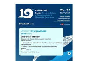 Directora de «Diafanís» participó en actividad por el 10° aniversario de la Revista «Balajú» de la Universidad Veracruzana Archivo - Archive Noticias - News Número 22 - Noviembre 2024 27 de noviembre de 2024 Mendoza [Argentina] 27 nov. [Revista Diafanís].- Hoy 27 de noviembre a partir de las 16 hs. de México, se llevaron a cabo las actividades previstas por el 10° aniversario de la revista Balajú, Revista de Comunicación y Cultura de la Universidad Veracruzana, las cuales son realizadas en conjunto con el Centro de Estudios de la Cultura y la Comunicación (CECC UV) de la mencionada casa de estudios, en su segundo día. La apertura de la jornada se dio con una mesa redonda sobre experiencias editoriales de dos revistas mexicanas y una argentina, La mesa fue coordinada por el Prof. Raciel. D. Martínez de México. Las participantes fueron las editoras: Prof. Diana Luz Sánchez, de la revista La Palabra y el Hombre, de la Universidad Veracruzana; la Prof. Mariana Morales, de la revista La Ciencia, revista de divulgación científica y tecnológica de México y la Prof. Marisa Avogadro Thomé, directora – editora de Revista Diafanís. Arte, Ciencia y Comunicación de Mendoza, Argentina, quien participó en modalidad a distancia. Al finalizar con la rueda de preguntas, el público asistente efectuó preguntas sobre las publicaciones y luego se siguió con las actividades previstas en el programa.