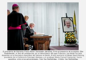Presidente alemán firma libro de condolencias por la muerte del papa Abril 2025 Archivo - Archive Noticias - News 25 de abril de 202527 de abril de 2025 Berlín, 25 abr (dpa) – El presidente alemán, Frank-Walter Steinmeier, firmó hoy el libro oficial de condolencias por la muerte del papa Francisco en la Nunciatura Apostólica de Berlín y lamentó su fallecimiento. «Lloro la pérdida del papa Francisco junto a los católicos de Alemania y de todo el mundo», escribió. «Con Francisco, el mundo ha perdido un faro luminoso de esperanza, un defensor confiable de la humanidad y un cristiano convincente», añadió. «Su modestia, su espontaneidad y su humor, su fe palpablemente profunda y sus pedidos de misericordia conmovieron a las personas en todo el mundo», indicó. Además de Steinmeier, también firmaron el libro de condolencias su esposa, Elke Büdenbender, la ministra federal del Interior en funciones, Nancy Faeser, el presidente de la Conferencia Episcopal Alemana, monseñor Georg Bätzing, y el nuncio apostólico, arzobispo Nikola Eterović. Los dolientes tendrán la oportunidad de hacerlo por la tarde. El libro también estará disponible el lunes y el martes. La Nunciatura Apostólica, ubicada en el barrrio berlinés de Neukölln, es la representación diplomática de la Santa Sede en Alemania.