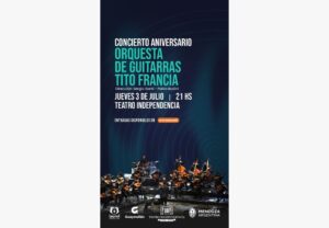 Concierto aniversario – Orquesta de Guitarras Tito Francia se presenta el 3 de julio en el Teatro Independencia Archivo - Archive Junio 2025 Noticias - News 14 de junio de 2025 Mendoza, (Argentina), 12 jun (PB dirección).- La Orquesta de Guitarras Tito Francia cumple 12 años y lo celebra con un concierto especial en el escenario más emblemático de Mendoza, el Teatro Independencia, el jueves 3 de julio desde las 21 hs. Con 27 músicos en escena y la participación de artistas invitados, bajo la dirección de Sergio Santi y Pablo Budini, el espectáculo propone un recorrido por las obras más destacadas de su repertorio. Un viaje musical por géneros clásicos, folclore argentino, latinoamericano, tango, música contemporánea y de banda sonora. Declarada de Interés Cultural a nivel provincial y nacional, la orquesta es hoy un referente cuyano con proyección nacional. Entradas disponibles en: https://www.entradaweb.com.ar/evento/e1f8062d/step/1