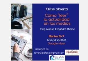 Mendoza [Argentina] 1 jul [Revista Diafanís].-  El martes 8 de julio se realizará la clase abierta Cómo «leer» la actualidad en los medios, en modalidad virtual, a cargo de la directora y editora de la revista internacional Diafanís, Mag. Marisa Avogadro Thomé.