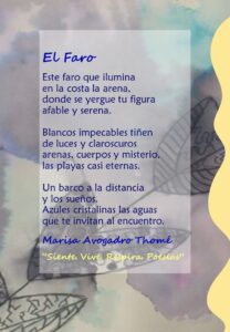 El Faro – Poesía de Marisa Avogadro Thomé Archivo - Archive Arte -Art Número 24 - Julio 2025 Poesías 10 de julio de 202517 de julio de 2025 Mag. Marisa Avogadro Thomé – Escritora y periodista argentina De su libro: «Siente. Vive. Respira. Poesías» Ilustración de tapa: Zahy Persia me.avogadro@gmail.com.ar