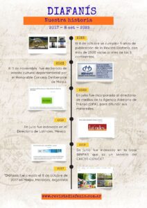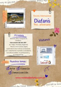8 de octubre: Noveno aniversario de la Revista Internacional Diafanís Archivo - Archive Noticias - News Octubre 2025 8 de octubre de 20258 de octubre de 2025 Mendoza (Argentina), 8 oct. (Revista Diafanís).- La revista internacional «Diafanís. Arte, Ciencia y Comunicación» fue creada el 8 de octubre de 2017, cumpliendo este año 9 años de labor ininterrumpida. La publicación es editada desde Maipú, Mendoza, Argentina por la Mag. Marisa Avogadro Thomé, quien también la dirige,y se aboca a temas de arte, ciencia y comunicación. Mensualmente tiene más de 2500 vistas de los cinco continentes. Está indexada en dos importantes bases científicas: BINPAR (Argentina) y Latindex (México) y fue incorporada por la Agencia Alemana de Prensa en el año 2022 como medio de comunicación latinoamericano y difunde sus noticias. Registada con el ISSN 2591 4227, esta revista digital cuatrimestral está formada por varias secciones, entre ellas, la de entrevistas, que tiene en la actualidad un centenar de reportajes. Se edita en varios idiomas y para participar se deben consultar los detalles en la sección Política editorial.