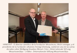 Cartas donadas desde Alemania cuentan cómo Mozart componía a los 4 años Archivo - Archive Noticias - News Número 25 - Noviembre 2025 29 de noviembre de 2025 Salzburgo (Austria), 28 nov. (dpa) – Un niño de cuatro años está sentado a la mesa, moja torpemente la pluma en el tintero y compone un concierto para piano, cuya complejidad es tal que ni siquiera él mismo, Wolfgang Amadeus Mozart, puede tocarla. A continuación, su padre revisa la composición y, ante el talento de su hijo, rompe a llorar de emoción. Esta escena, descrita por un amigo de la familia Mozart en una carta, forma parte como manuscrito original de los doce documentos que la Fundación Internacional Mozarteum de Salzburgo ha recibido como donación – parcial, casi total – de una familia de coleccionistas de Colonia, en el oeste de Alemania. «No habríamos podido comprar esta colección», declaró el director científico de la Fundación Mozarteum, Ulrich Leisinger. El experto explicó que cada página de Mozart cuesta en el mercado alrededor de 100.000 euros (115.000 dólares). Los documentos donados por la familia de la colección de Hans Joachim Eggers son la adquisición más importante para el Mozarteum en 100 años, detalló. Según la Fundación, el virólogo, fallecido en 2016, pasó 30 años reuniendo la colección privada de Mozart más importante de Alemania. Sus herederos han cumplido ahora su deseo de ceder los documentos a la fundación. Dificultades del compositor «¡No puedo pagar ahora, ni siquiera la mitad!», describe Mozart el 15 de febrero de 1783 al hablar de sus dificultades económicas en una carta a una mecenas. «¡Le ruego por el amor de Dios que me ayude a no perder mi honor y mi buen nombre!», le dice el joven, de entonces 27 años. «Mi pobre esposa se encuentra un poco indispuesta y, por lo tanto, no puedo dejarla sola», explica al justificar el hecho de pedirle dinero por carta y no en persona. Es bien sabido que el genio de la música (1756-1791) tenía problemas económicos recurrentes. Esto se debía no tanto a la falta de ingresos sino a los grandes gastos en los que incurría. Todos los sentidos dedicados a la música Desde el punto de vista del director científico de la Fundación Mozarteum, algunos de los documentos son especialmente valiosos: la única copia del Miserere KV 85 de 1770, una carta en la que Mozart y su hermana liquidan la herencia de su padre en 1787, por aquel entonces recientemente fallecido, y los apuntes del trompetista de la corte de Salzburgo Johann Andreas Schachtner con anécdotas de la infancia de Mozart. «Tan pronto como comenzó a dedicarse a la música, todos sus sentidos quedaron tan muertos para cualquier otra actividad que incluso los juegos infantiles y las travesuras tenían que ir acompañados de música para que le resultaran interesantes», relara Schachtner en una carta a la hermana de Mozart sobre la abrumadora fascinación que la música ejercía sobre el pequeño Mozart. La Fundación Mozarteum posee la mayor colección del mundo de documentos originales de los Mozart, abarcando más de la mitad de todos los documentos conocidos de la familia, entre ellos unas 200 cartas originales del propio Wolfang Amadeus Mozart. Los nuevos documentos se pueden ver hasta el 1 de febrero de 2026 en la Casa Natal de Mozart en Salzburgo.