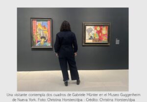 Gran muestra en homenaje a pintora Gabriele Münter en Nueva York Archivo - Archive Noticias - News Número 25 - Noviembre 2025 10 de noviembre de 2025 Nueva York, 9 nov. (dpa) – El Museo Guggenheim de Nueva York rinde homenaje a la pintora expresionista alemana Gabriele Münter (1877-1962) con una gran exposición cuando se cumplen 63 años de su muerte. Se trata de la primera exposición individual de Münter en un museo neoyorquino, informó la institución situada en Central Park, Manhattan. La muestra «llevaba mucho tiempo pendiente», explicó la comisaria, Megan Fontanella. En el famoso edificio con forma circular se exponen hasta el 26 de abril de 2026 numerosos retratos y autorretratos de la pintora, cofundadora de la comunidad artística Der Blaue Reiter (El jinete azul) y compañera de Wassily Kandinsky, considerada una de las representantes más conocidas del expresionismo en Alemania. Además, se pueden ver muchas otras pinturas que muestran, entre otros, los Alpes y la región prealpina con Murnau y el lago Staffelsee, donde Münter pasó gran parte de su vida. Como parte de la exposición «Gabriele Münter: Contours of a World», se exhiben por primera vez asimismo en un museo estadounidense fotografías de Münter tomadas entre 1898 y 1900 durante un viaje a Estados Unidos. En total se pueden ver más de 50 pinturas y unas 20 fotografías.