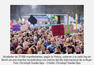 Berlín, 8 mar. (dpa) – Miles de personas se manifestaron hoy en las calles de Berlín con motivo de la celebración del Día Internacional de la Mujer, en una convocatoria realizada por una amplia coalición de sindicatos, asociaciones e iniciativas.