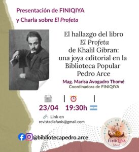 Mendoza [Argentina], 17 abr. [Prensa Diafanís].- En el marco del Día Mundial del Libro y del Derecho de Autor, la revista internacional Diafanís. Arte, Ciencia y Comunicación, Mar y Arte Ediciones y la Biblioteca Popular Pbro. Celestino Pedro Arce invitan a la presentación del Espacio de Estudio FINIQIYA: Cultura Libanesa y Mediterránea con proyección al Mundo Árabe, junto a una charla sobre una joya editorial, el libro «El Profeta» de Khalil Gibran encontrado en la mencionada biblioteca.