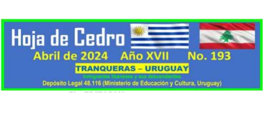 Abril: «Hoja de Cedro» disponible para descargar de forma libre en Diafanís Abril 2024 Archivo - Archive Noticias - News 1 de abril de 2024 HOJA DE CEDRO. Abril de 2024 Hoja de Cedro, la conocida publicación artesanal sobre el Líbano, inmigrantes libaneses y descendientes, que publica desde Tranqueras, Uruguay, su creador y productor José María Almada Sad, publicó su ejemplar del mes de abril de 2024, Año XVI, N° 193; que puede descargarse de forma