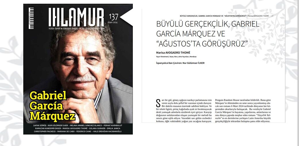 Con un artículo sobre García Máquez la escritora Marisa Avogadro Thomé participó en la revista turca «Ihlamur» Abril 2024 Archivo - Archive Noticias - News 17 de abril de 2024 La escritora mendocina, Mag. Marisa Avogadro Thomé, participó con su artículo: "Realismo Mágico y Gabriel García Márquez. Por qué Nos vemos en agosto", en la nueva edición de la revista turca Ihlamur número 137, dedicada al escritor colombiano Gabriel García Márquez, Premio Nobel de Literatura 1982. La autora argentina, directora y