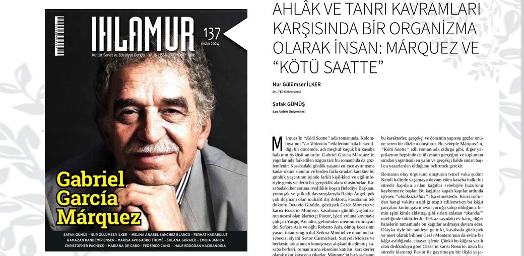 Márquez y la «Mala Hora»: nuevo artículo de Nur Gülümser İlker y Şafak Gümüş en la revista turca «Ihlamur» Abril 2024 Archivo - Archive Noticias - News 18 de abril de 202418 de abril de 2024 "El ser humano como organismo frente a los conceptos de moral y Dios: Márquez y la Mala Hora” de Nur Gülümser İlker y Şafak Gümüş, es uno de los 12 artículos que forman el nuevo número de la revista turca Ihlamur, dedicado al conocido escritor colombiano Gabriel García Márquez. Ihlamur (tilo es