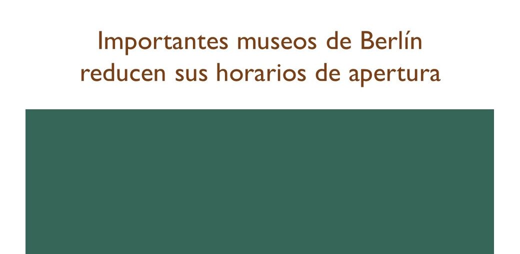 Importantes museos de Berlín reducen sus horarios de apertura Abril 2024 Archivo - Archive Noticias - News 17 de abril de 2024 Berlín, 15 abr (dpa) - Varios museos importantes de Berlín decidieron reducir sus horarios de apertura a causa de la difícil situación financiera que atraviesan, con costes en alza y presupuestos escasos. El plan prevé, a partir de este martes, cerrar un día más a la semana como también reducir las horas de apertura. Entre