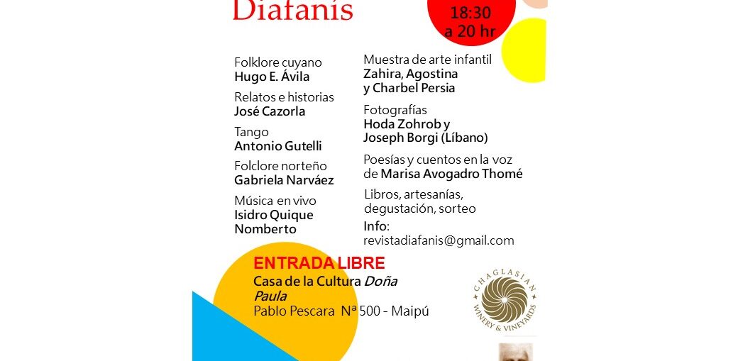 Evento cultural por el 5to Aniversario de Diafanís el 11 de noviembre Archivo - Archive Noticias - News Octubre 2022 19 de octubre de 202223 de octubre de 2022 Con motivo de celebrarse el 5to aniversario de la revista internacional Diafanís. Arte, Ciencia y Comunicación [www.revistadiafanis.com.ar], se realizará un evento cultural el 11 de noviembre desde las 18:30 hr en la Casa de la Cultura Doña Paula, del departamento de Maipú. En el mismo actuarán: en folclore cuyano: Hugo E.