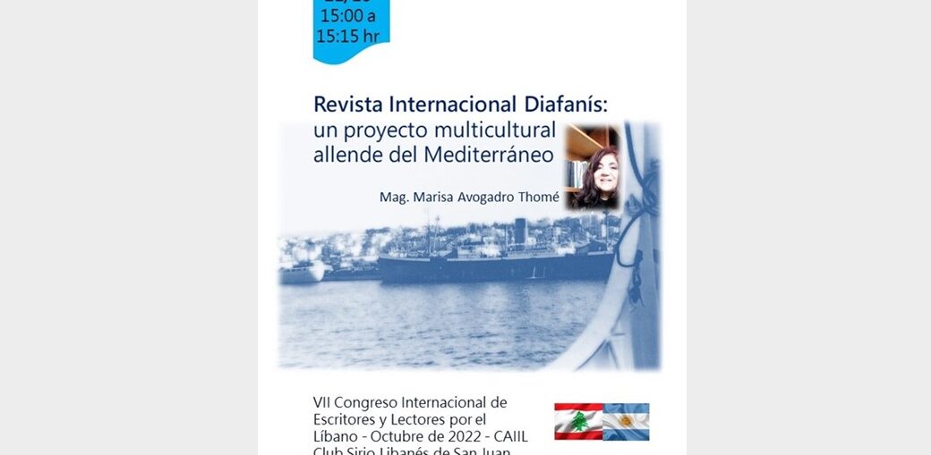 Ponencia presentada en el VII Congreso Internacional de Escritores y Lectores por el Líbano Archivo - Archive Ciencias y Comunicación - Science and Communication Número 16 - Noviembre 2022 6 de noviembre de 20226 de noviembre de 2022 Mag. Marisa Avogadro Thomé - Directora y Editora de la Revista Diafanís Argentina - me.avogadro@gmail.com "Revista Internacional Diafanís: un proyecto multicultural allende el Mediterráneo", fue el título del trabajo de investigación que presenté en el VII Congreso de Escritores y Lectores por el Líbano, organizado por C.A.I.I.L y realizado en el Club