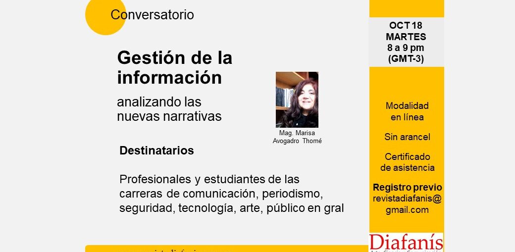 Conversatorio 18/11- Gestión de la información: analizando las nuevas narrativas Archivo - Archive Noticias - News Octubre 2022 4 de octubre de 202212 de octubre de 2022 Con el auspicio de la revista internacional Diafanís, se realizará el martes 18 de octubre a las 8hr pm de Argentina (GMT-3) el conversatorio Gestión de la información: analizando las nuevas narrativas. El mismo estará a cargo de la Mag. Marisa Avogadro Thomé, de Mendoza, Argentina. Las nuevas tecnologías de la