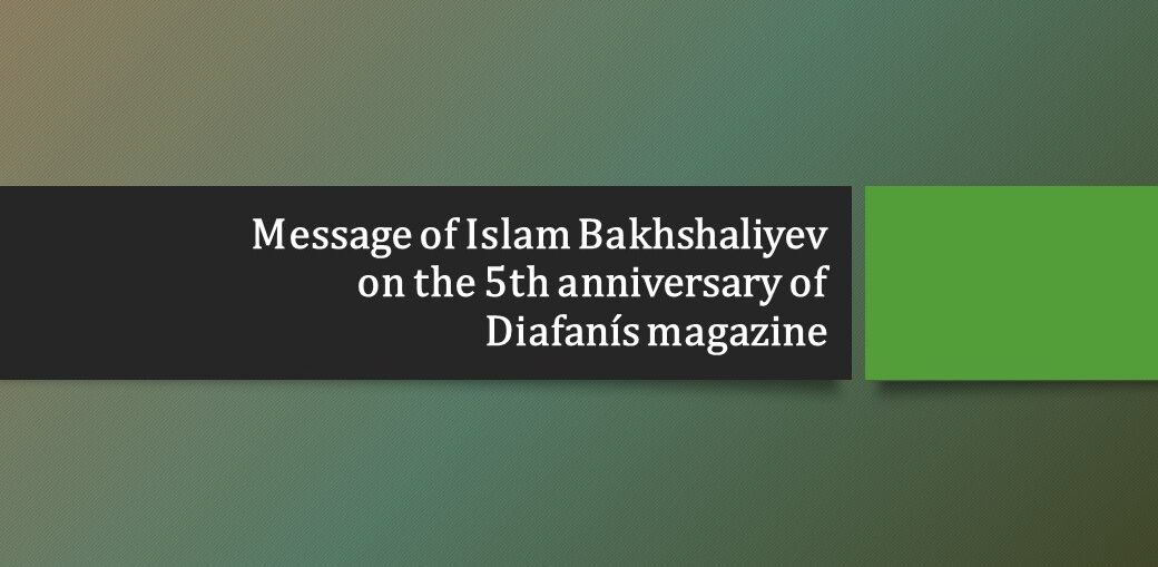 Diafanís Anniversary – Message of Islam Bakhshaliyev on the 5th anniversary of Diafanís magazine – English and Spanish versions Archivo - Archive Noticias - News Octubre 2022 10 de octubre de 202210 de octubre de 2022 Islam Bakhshaliyev – Ambassador for Peace Director of the Social and Psychological Rehabilitation Centre of the Youth – “Dirchelish”(Revival) dirchelish_azerbaijan@yahoo.com Dear Marisa! When I heard that the 5th anniversary of the "Revista Diafanis" magazine is approaching, I was very happy, because we have been working closely with you for maybe 3 of these 5