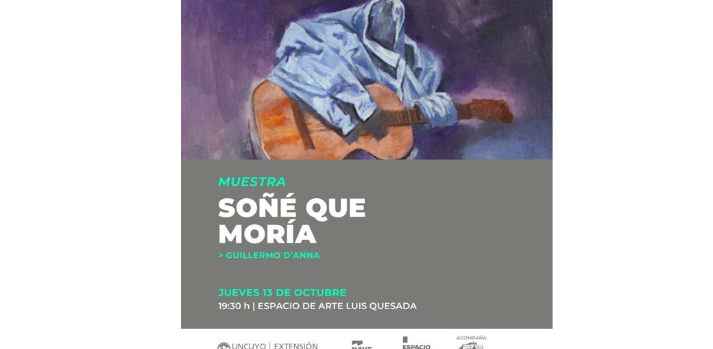 Se inauguró la muestra «Soñé que moría» del artista Guillermo D´anna Archivo - Archive Noticias - News Octubre 2022 14 de octubre de 2022 Se inauguró este jueves 13 de octubre la muestra Soñé que moría del artista visual Guillermo D´anna; en el Espacio de Arte Luis Quesada, ubicado en la Nave UNCuyo, Juan Agustín Maza 250, en la Ciudad de Mendoza. La muestra puede visitarse de miércoles a domingos de 18 a 21 hr y