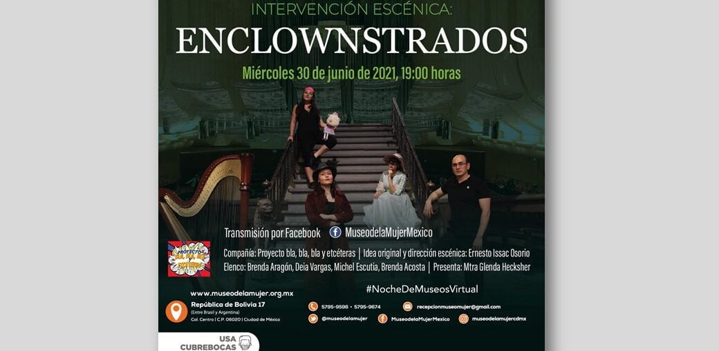 Enclowstrados: noche de museos en el Museo de la Mujer de México Archivo - Archive Junio 2021 Noticias - News 23 de junio de 2021 El Museo de la Mujer de México invita a su Noche de Museos correspondiente al mes de junio con la intervención escénica Enclownstrados, del Proyecto bla, bla, bla y etcéteras. Miércoles 30 de junio, 19 horas de México, por la cuenta oficial de Facebook del museo. De acuerdo con las organizadoras: “Esta