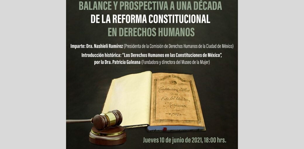 Balance y prospectiva a una década de la Reforma Constitucional en DDHH en el Museo de la Mujer de México Archivo - Archive Junio 2021 Noticias - News 5 de junio de 20215 de junio de 2021 El Museo de la Mujer de México invita a la conferencia Balance y prospectiva a una década de la Reforma Constitucional en Derechos Humanos, que impartirá la Dra. Nashieli Ramírez, Presidenta de la Comisión de Derechos Humanos de la Ciudad de México. Introducción histórica: “Los Derechos Humanos en las Constituciones de