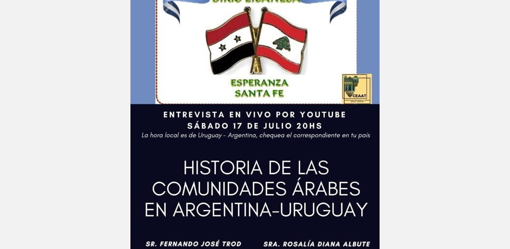 Centro de Estudios Árabes de Uruguay entrevistará a la Asociación Sirio Libanesa de Esperanza Archivo - Archive Noticias - News Número 12 - Julio de 2021 11 de julio de 202111 de julio de 2021 Contacto: sirioslibanesesesperanza@gmail.com