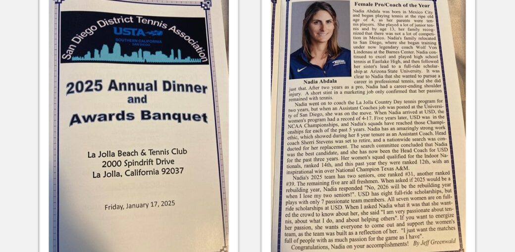Nadia Abdala distinguida como entrenadora femenina de tenis del año en la Universidad de San Diego en California Archivo - Archive Enero 2025 Noticias - News 22 de enero de 202522 de enero de 2025 La deportista mexicana descendiente de libaneses, Nadia Abdala, de amplia trayectoria en el tenis femenino, quien de los últimos 3 años de los 8 años que lleva trabajando en la Universidad de San Diego, ya fue nombrada y promovida a entrenadora en jefe, y fue nombrada entrenadora femenina del año