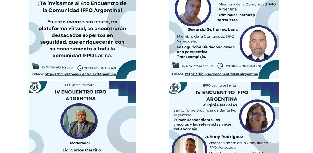 IV Encuentro de la Comunidad IFPO Argentina el 16 de noviembre Archivo - Archive Noticias - News Número 19 - Noviembre de 2023 6 de noviembre de 20236 de noviembre de 2023 Buenos Aires, nov, 06 ( IFPO Comunidad Arg) - IFPO Capítulo Argentina (Fundación Internacional para Oficiales de Protección) realizará el 16 de noviembre el IV Encuentro de la Comunidad IFPO Argentina en modalidad virtual, a las 20h (GMT -3) a través de la plataforma Zoom. En este evento sin costo, virtual, se