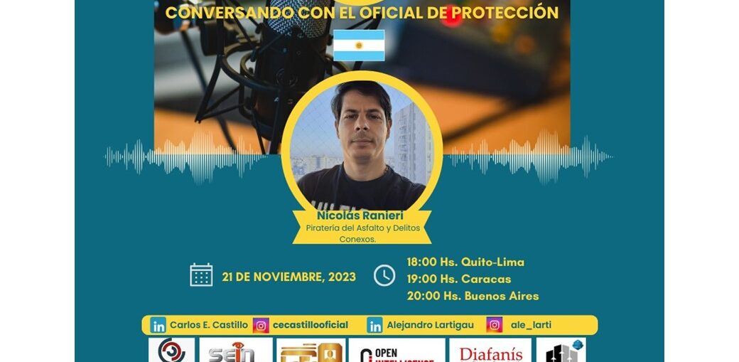 Piratas del asfalto y delitos conexos los temas de hoy en «Conversando con el oficial de protección» – ed. argentina: Archivo - Archive Noticias - News Número 19 - Noviembre de 2023 21 de noviembre de 202321 de noviembre de 2023 Buenos Aires, 21 nov (Prensa Conversando con el oficial de protección) - El martes 21 de noviembre a partir de las 20 hs. de Buenos Aires (Argentina), una nueva edición del programa «Conversando con el oficial de protección» edición argentina, presenta al profesional Nicolás Ranieri, con el tema piratería del