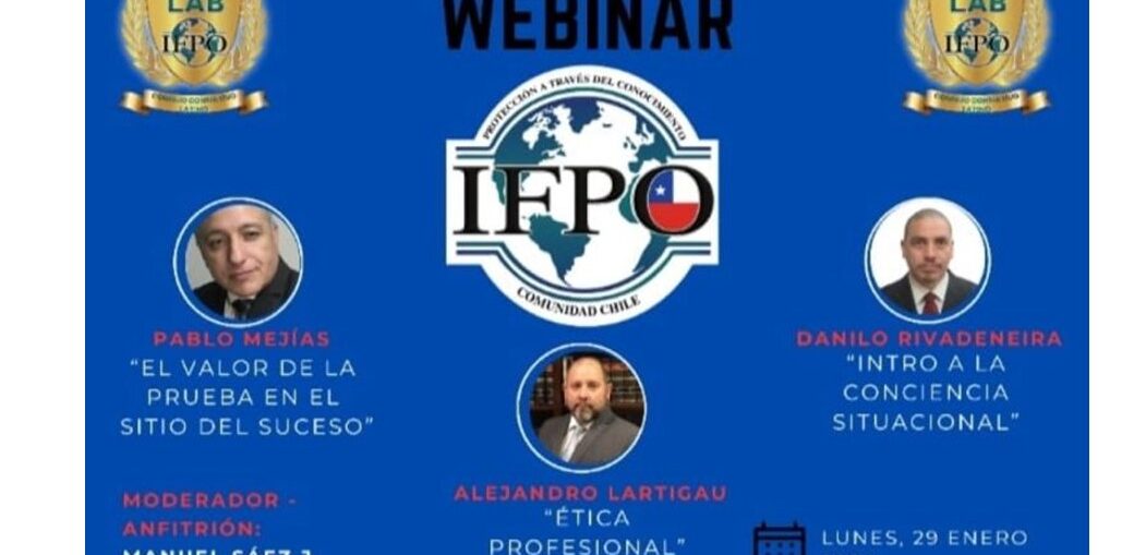 Comunidad IFPO Chile: primer «webinar» el 29 de enero Archivo - Archive Enero 2024 Noticias - News 8 de enero de 2024 La Fundación Internacional de Oficiales de Protección – IFPO – Comunidad Chile, organiza el pirmer webinar del año 2024 con la participación de conocidos profesionales del área: Alejandro Lartigau, Pablo Mejías y Danilo Rivadeneira, el 29 de enero desde las 19hs de Chile. El mismo está destinado a miembros de la