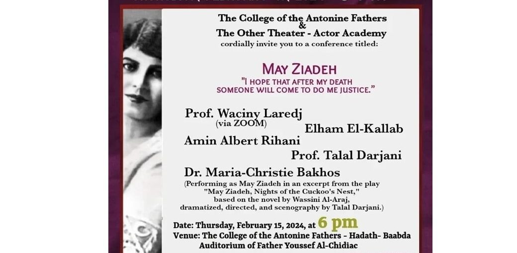 Conference about May Ziadeh in Lebanon on February 15th Archivo - Archive Febrero 2024 Noticias - News 7 de febrero de 2024 The College of the Antonine Fathers & The Other Theater Actor Academy cordially invite you to a conference titled: May Ziadeh "I hope that after my death someone will come to do me justice” - Prof. Waciny Laredj (via Zoom) - Dr. Ilham El-Kallab - Amin Albert Rihani - Prof. Talal Darjani - Dr. Maria Christie Bakhos