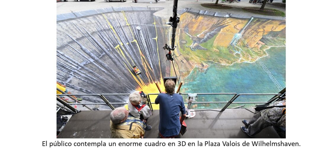 Artistas decoran ciudad alemana en festival de pintura callejera 3D Agosto 2023 Archivo - Archive Noticias - News 7 de agosto de 2023 Wilhelmshaven (Alemania), 5 ago (dpa) - La ciudad de Wilhelmshaven volvió a convertirse este fin de semana en una exposición de arte al aire libre con las pinturas realizadas por pintores callejeros de once países. La iniciativa se vio acompañada de buen tiempo, según comentó un portavoz de la oficina de