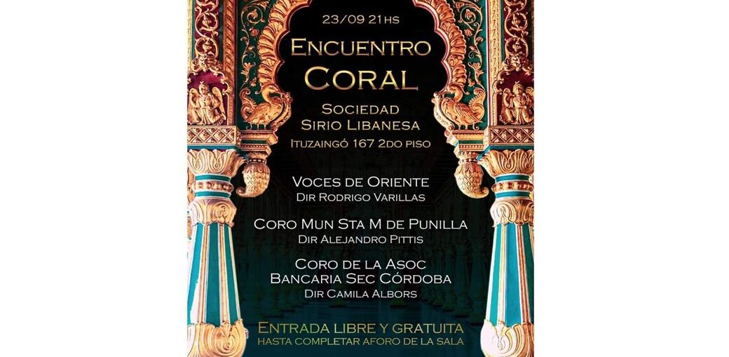 Encuentro Coral en el primer aniversario del Coro Voces de Oriente en Córdoba Archivo - Archive Noticias - News Setiembre 2023 12 de septiembre de 2023 Con motivo de cumplirse el primer aniversario del Coro Voces de Oriente, se ha organizado un Encuentro Coral en la Sociedad Sirio Libanesa de Córdoba, sede del mencionado coro, el 23 de setiembre a las 21 hs. Acompañarán a Voces de Oriente su director: Rodrigo Varillas y los maestros Raffi