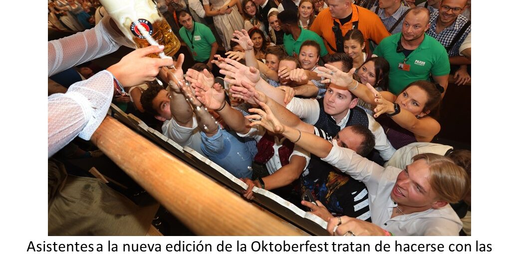 Múnich inaugura la Oktoberfest y espera seis millones de asistentes Archivo - Archive Noticias - News Setiembre 2023 17 de septiembre de 202317 de septiembre de 2023 Múnich, 16 sep (dpa) - Con dos golpes de martillo, el alcalde de Múnich abrió hoy al mediodía el primer barril de cerveza y dio comienzo a la tradicional Fiesta de la Cerveza con el grito "O'zapft is!" (¡Ya está abierto!, en bávaro). Acto seguido, Dieter Reiter le entregó la primera jarra de cerveza