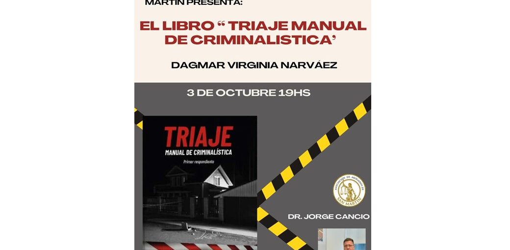 Dagmar Virginia Narváez presenta su libro «Triaje Manual de Criminalística» Archivo - Archive Noticias - News Setiembre 2023 23 de septiembre de 202323 de septiembre de 2023 Presentación virtual del libro Triaje Manual de Criminalística Autora: Dagmar Virginia Narváez Santa Fe - Argentina 3 de octubre a las 19 hs de Argentina Contacto: narvaezvirginia837@gmail.com