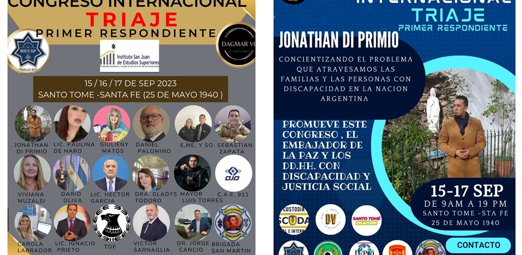 1° Congreso Internacional Triaje Primer Respondiente del 15 al 17 de setiembre en Santa Fe Archivo - Archive Noticias - News Setiembre 2023 5 de septiembre de 20235 de septiembre de 2023 Se llevará a cabo en Santo Tomé, provincia de Santa Fe, el 1er Congreso Internacional Triaje Primer Respondiente, del 15 al 17 de setiembre, en el Centro Cultural 12 de septiembre ubicado en calle 25 de mayo N° 1940, Santo Tomé, Santa Fe, Argentina. El mismo está organizado por: DAGMAR VL