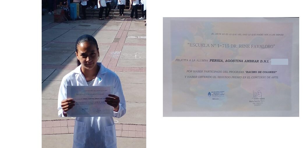 Agostina Ámbar Persia recibió una felicitación de su escuela por obtener el 2do. premio en el concurso de pintura Archivo - Archive Diciembre 2023 Noticias - News 16 de diciembre de 202316 de diciembre de 2023 Agostina Ámbar Persia – Mendoza – Argentina Agostina Ámbar Persia recibió una felicitación el viernes 15 de diciembre, en el acto de cierre del año escolar de la Escuela N° 1 – 715 Dr. René Favaloro de Perdriel, de Lujàn de Cuyo, Mendoza; por haber participado en