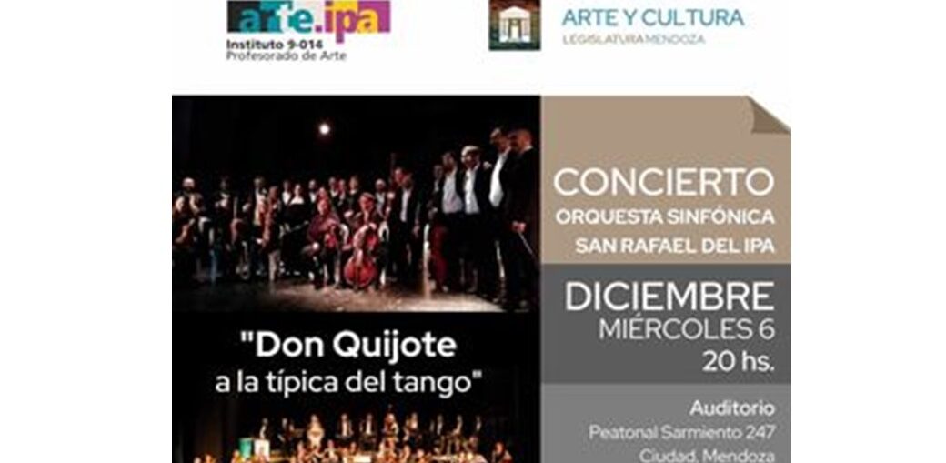 Orquesta Sinfónica San Rafael del IPA declarada de interés cultural por la Legislatura el 6 de diciembre Archivo - Archive Diciembre 2023 Noticias - News 5 de diciembre de 2023 San Rafael, dic 05 (Orquesta Sinfónica San Rafael). La Orquesta Sinfónica San Rafael del IPA fue declarada de Interés Cultural por la Legislatura Provincial de Mendoza y el miércoles 06 de diciembre celebrarán con un concierto en el auditorio de la Legislatura, en calle Peatonal Sarmiento 247, Ciudad, Mendoza, con