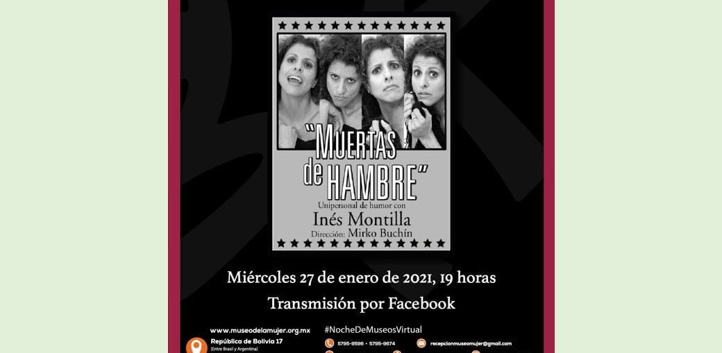 Noche de Museos con el monólogo Muertas de hambre en el Museo de la Mujer de México Archivo - Archive Enero 2021 Noticias - News 23 de enero de 2021 Para la Noche de Museos de enero del Museo de la Mujer de México, se presenta: "Muertas de hambre", un monólogo de la actriz argentina María Inés Montilla La cita es el miércoles 27 de enero, a las 19 horas de México; transmisión por Facebook. Las organizadoras expresaron que: “En esta propuesta