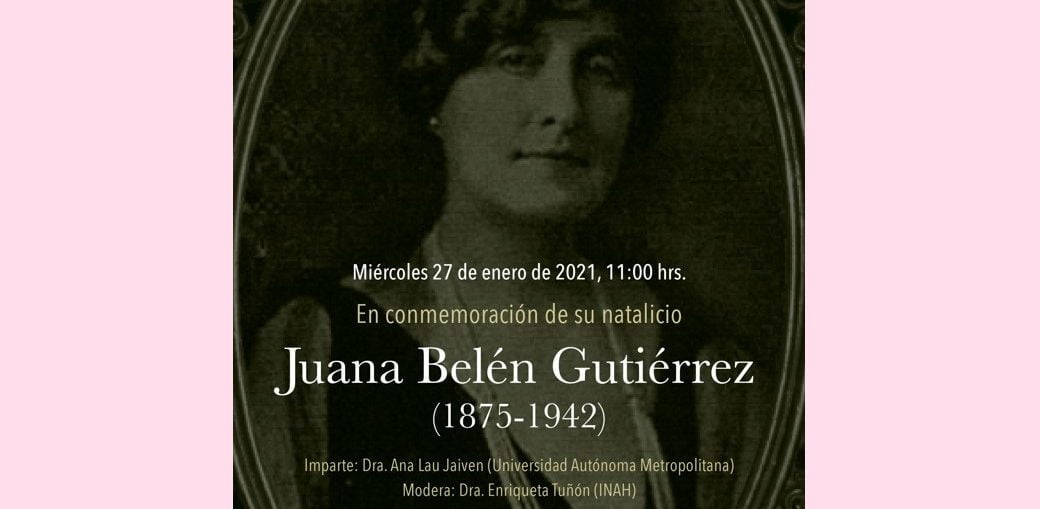 Juana Belén Gutierrez: conferencia virtual – Museo de la Mujer de México Archivo - Archive Enero 2021 Noticias - News 23 de enero de 202123 de enero de 2021 El Museo de la Mujer invita a la conferencia virtual sobre la vida y obra de "Juana Belén Gutiérrez (1875-1942)", en conmemoración de su natalicio. Imparte: Dra. Ana Lau Jaiven (Universidad Autónoma Metropolitana); modera: Dra. Enriqueta Tuñón (INAH). “Juana Belén, una mujer adelantada para su tiempo que fue anarquista, opositora al