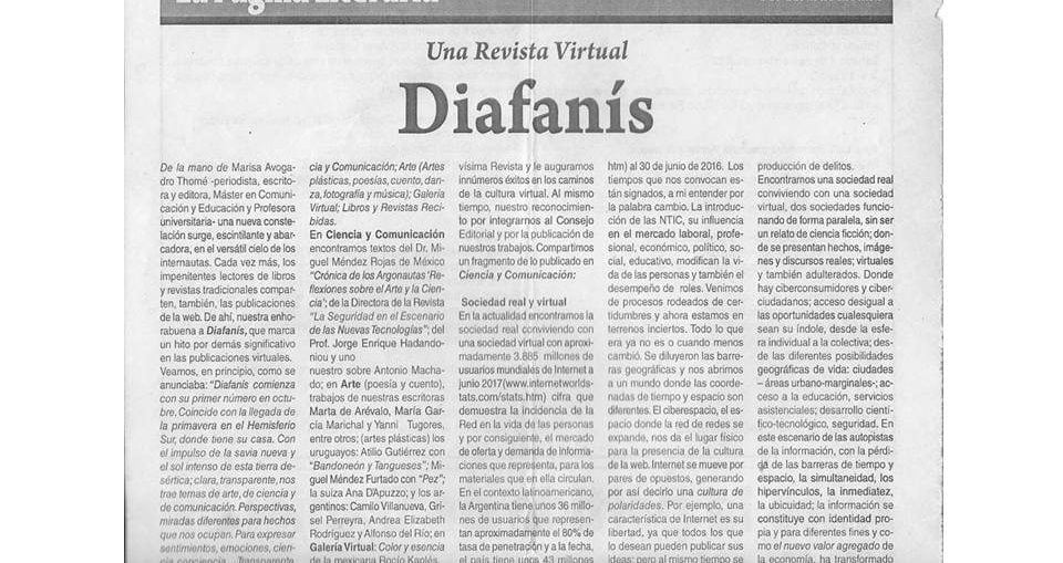 Reseña de Revista Diafanís en La Página Literaria del diario Hoy Canelones de Uruguay Archivo - Archive Febrero 2019 Noticias - News 21 de febrero de 201921 de febrero de 2019 El escritor uruguayo, director de La Página Literaria del diario Hoy Canelones de Canelones, Uruguay, Profesor Gerardo Molina; escribió una reseña a la Revista Diafanís, el jueves 2 de noviembre de 2017, en la página 10 del mencionado periódico.