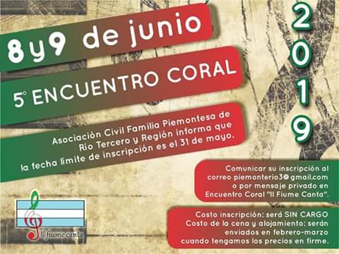 Encuentro Nacional de Coros Italo-piemonteses «Il fiume canta 2019» en la Argentina Archivo - Archive Mayo 2019 Noticias - News 4 de mayo de 20194 de mayo de 2019 Se realizará el 5to Encuentro Nacional de Coros Italo-piemonteses "Il fiume canta 2019" en Río Tercero, provincia de Córdoba, Argentina, del 8 al 9 de junio del corriente año. Los coros interesados en participar, pueden comunicarse para solicitar los requisitos de participación, del repertorio, inscripción, estadía, entre otros, al celular: 3571