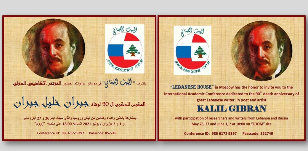 The Lebanese House in Moscow organizes the International Academic Conference on the 90th death anniversary of Gibran Khalil Gibran Archivo - Archive Mayo 2021 Noticias - News 22 de mayo de 202122 de mayo de 2021 Conference: Gibran Khalil Gibran Lebanese House from Moscow, Russia May 26, 27 and June 1, 2, 2021 Time: 6 hr pm (Russia time) Zoom site: ID: 98662729397 - Passcode 852749