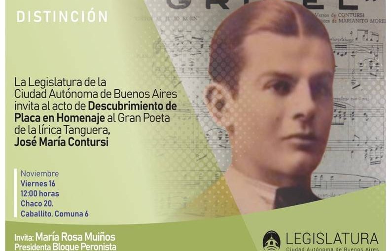 Reconocimiento al poeta tanguero José María Contursi Archivo - Archive Noticias - News Número 4 -Noviembre 2018 3 de noviembre de 2018 El viernes 16 de noviembre a las 12 hr la Legislatura de la Ciudad Autónoma de Buenos Aires, Argentina, colocará una placa recordatoria a José María Contursi, poeta lírico del tango, en la que fue su casa, en calle Chaco al número 20. Por tal motivo, Revista Diafanís dialogó con la