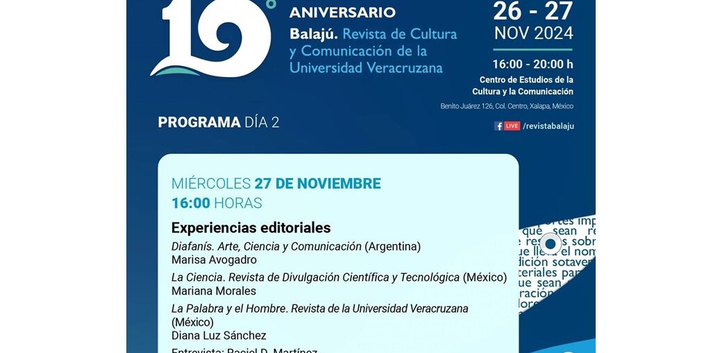 Actividades por el 10° aniversario de la Revista Balajú de la Universidad Veracruzana Archivo - Archive Noticias - News Número 22 - Noviembre 2024 25 de noviembre de 202425 de noviembre de 2024 Veracruz (México), 25 nov [Revista Balajú].- El 26 y 27 de noviembre desde la 16 hs. de México, se realizarán las actividades organizadas con motivo del 10° aniversario de Balajú, Revista de Comunicación y Cultura de la Universidad Veracruzana, las cuales son realizadas en conjunto con el Centro de Estudios